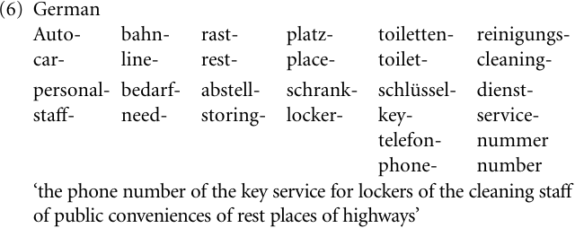 Quite a number of languages, such as Romance languages, have no productive recursion in compounding while others, such as Germanic languages, allow productive noun–noun compounding. Thus, French speakers can use at best simple recursion in compounding, for example homme grenouille (man frog) ‘frog man’; root compounding is unproductive, limited to frozen and self-conscious coinages (Bauer 1978). For English speakers on the other hand, undersea divers can appear in constructions of productive recursion, cf. (3a). The magnitude that productivity may have can be illustrated with example (6). We have never heard a German speaker uttering this compound, and it probably never will be uttered; however, it is a grammatically correct instance of productive recursive compounding.