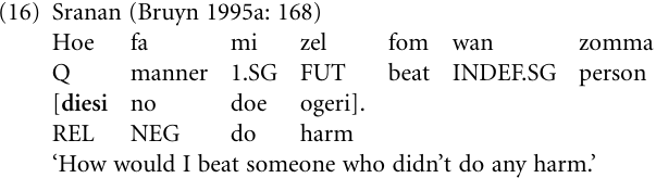 As we observed in “The demonstrative channel”, the most frequent development in the languages of the world is to create a new relative clause structure via the grammaticalization of demonstrative pronouns (not attributes), and creoles have also made use of this mechanism, as we will now demonstrate with an example from the English-based creole Sranan of Suriname.1 Sranan arose in the late seventeenth century on the plantations of Suriname, which was made a British Colony in 1651; in 1668, Dutch became the colonial language. As in pidgins and newly emerged creoles, there were essentially no formally marked relative clauses in early Sranan: The English relativizers were lost, and most of the text examples that were seemingly unmarked relative clauses might also receive alternative interpretations, and there is no evidence that there was a recursive structure of relativization. Zero marking of relative clauses continued throughout the nineteenth and twentieth centuries.
