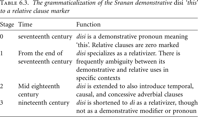 To conclude, Sranan speakers appear to have created subordinate clause structures in accordance with universal parameters of grammaticalization. A strikingly similar example was presented in “The rise of new functional categories”, involving the development of the Kenya Pidgin Swahili demonstrative ile ‘that’. As grammaticalization theory would predict, in both cases there was a sequence of stages as sketched in Table 6.4.