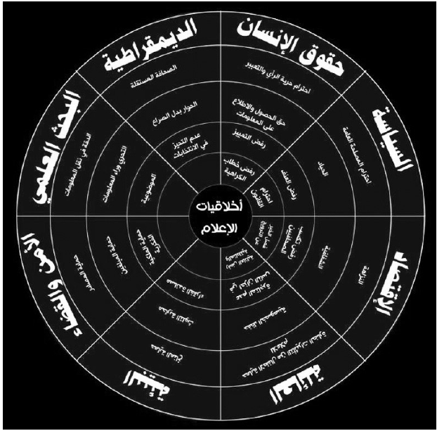 في الشكل السابق، رصدنا بعض التقاطعات في المبادئ التي جاءت من حقول بعيدة وصارت من بنود مدونات السلوك التي تلتزم بها الاجسام الصحفية في دول العالم حديثا.