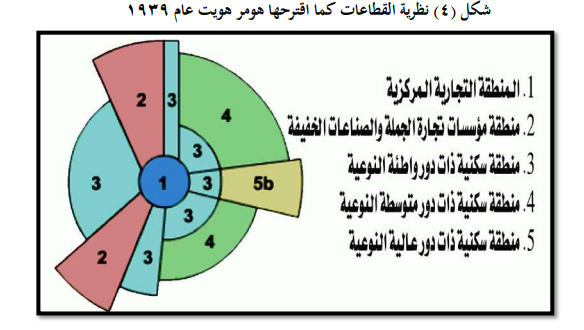 مقترح هذا النموذج هو الباحث الامريكي هومر هويت عام (1939) وقد اهتم فيها بتحليل وتركيب المنطقة السكنية في المدينة وطريقة نموها ، لذا استند في نموذجه على حقائق محددة تتعلق بسعر الارض وقيمة الايجار للمناطق السكنية ، واثر ذلك على قيمة استعمالات الارض الاخرى في المدينة ومراحل نظريته ان نمو المدينة يتم على شكل قطاعات متعددة تعتمد على طول شبكة المواصلات المختلفة للمدينة ، بمعنى اخر ميز بين نوعين من النمو والتوسع السكني ، (النمو المحوري) الذي يبدأ من المركز نحو الاطراف على طول خطوط المواصلات الرئيسة و النمو المركزي الذي يحدث بتوسع المدينة حول مركزها او منطقتها التجارية الرئيسة ومن خلال ذلك تظهر ثلاث مناطق سكنية هي منطقة الدور واطئة النوعية ، ومنطقة الدور متوسطة النوعية ، ومنطقـة الـدور عالية النوعية ، وان كلاً من هذه المناطق اذا تبـدأ من مركز المدينة وتستمر حتى اطرافها محافظة على خصائصها في اثناء عملية توسع المدينة ، تعد نظرية هومر هويت افضل من سابقتها لأنه لم يغفل تأثير طرق النقل على استعمالات الارض في المدينة ، ومع ذلك لا يعني خلوها من الانتقادات واهمها الغموض التي تمتد بهـا القطاعات من دون الاهتمام بالجوانب الاجتماعية للسكن ، فضلا عن حالة التداخل بين الدور واطئة النوعية مع دور متوسطة وعالية النوعية ، وهذا غير صحيح في اغلب مدن العالم ، كما انه لم يراع نمو الضواحي عند اطراف المدينة ودور طرق النقل على الرغم من الإشارة إلى ان هناك نمو محورياً على طول طرق النقل .