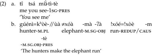 Another example of a structural constraint on morphological inflection comes from the Central Khoisan language //Ani and its system of object agreement (Vossen 1985).1 Finite verbs (except in the imperative) bear affixes that agree with a pronominal object in person, gender, and number (2a) or with a nominal object for number and gender (2b):