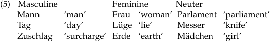 German has three genders called masculine, feminine, and neuter. Examples of nouns belonging to each gender are given in (5):