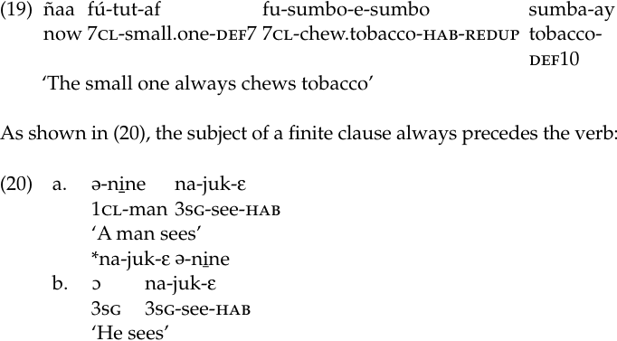 We have spent a great deal of space discussing Kujamaat Jóola morphology. It seems appropriate to conclude with a brief presentation of a few syntactic facts, ones that are related to its morphological analysis. We take as our starting point basic word order, which is SVO (Sapir 1965: 100; example from Hopkins 1990: 82–3):