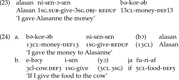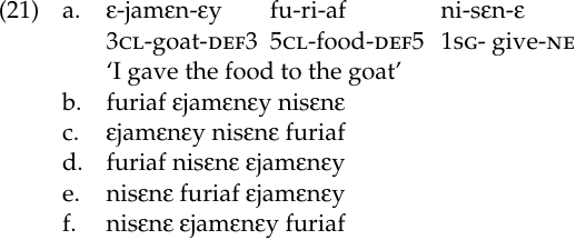 The order of verbal complements, however, is generally free. Any permutation of the sentence in (21a) is permitted, but they differ in what is emphasized: