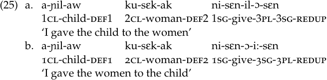 If two [−human] objects precede the verb, one – preferably the indirect object – is restated: