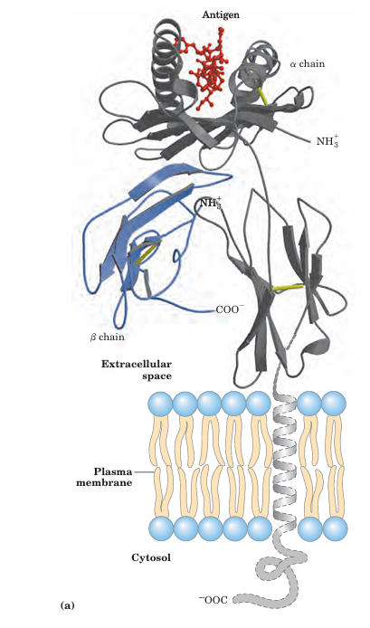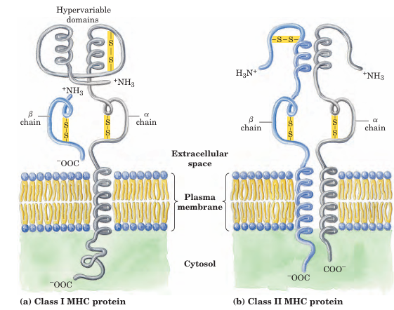 FIGURE 5–21 MHC proteins. These proteins consist α of β and chains. (a) In class I MHC proteins, the small β chain is invariant but the amino acid sequence of the α chain exhibits a high degree of variability, localized in specific domains of the protein that appear on the outside of the cell. Each human produces up to six different α chains for class I MHC proteins. (b) In class II MHC proteins, both the α and β chains have regions of relatively high variability near their amino-terminal ends.