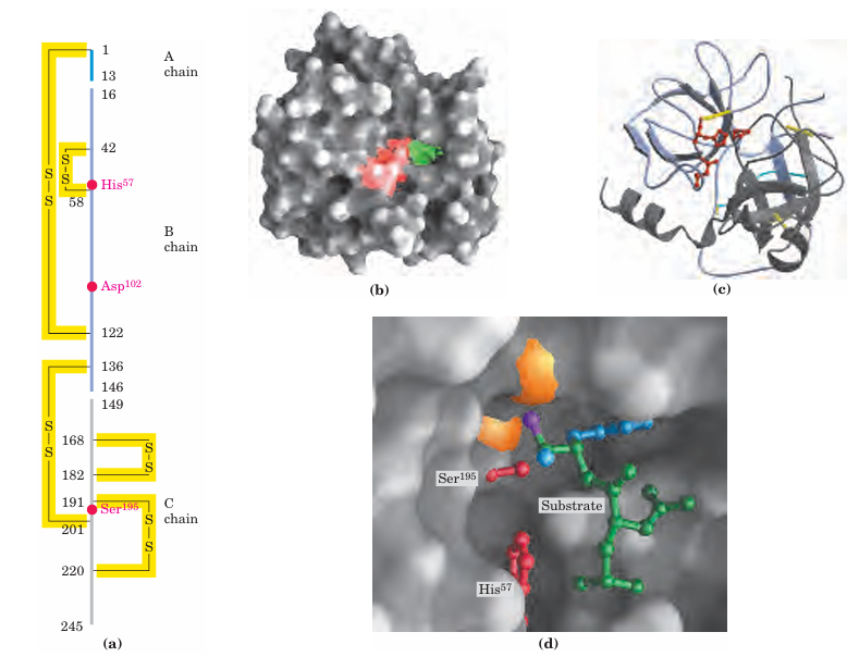 FIGURE 6–18 Structure of chymotrypsin. (PDB ID 7GCH) (a) A representation of primary structure, showing disulfide bonds and the amino acid residues crucial to catalysis. The protein consists of three polypeptide chains linked by disulfide bonds. (The numbering of residues in chymotrypsin, with “missing” residues 14, 15, 147, and 148, is explained in Fig. 6–33.) The active-site amino acid residues are grouped together in the three-dimensional structure. (b) A depiction of the enzyme emphasizing its surface. The pocket in which the aromatic amino acid side chain of the substrate is bound is shown in green. Key active-site residues, including Ser195, His57, and Asp102, are red. The roles of these residues in catalysis are illustrated in Fig ure 6–21. (c) The polypeptide backbone as a ribbon structure. Disul fide bonds are yellow; the three chains are colored as in part (a). (d) A close-up of the active site with a substrate (mostly green) bound. Two of the active-site residues, Ser195 and His57 (both red), are partly visible. Ser195 attacks the carbonyl group of the substrate (the oxygen is purple); the developing negative charge on the oxygen is stabilized by the oxyanion hole (amide nitrogens in orange), as explained in Fig ure 6–21. In the substrate, the aromatic amino acid side chain and the amide nitrogen of the peptide bond to be cleaved (protruding toward the viewer and projecting the path of the rest of the substrate polypeptide chain) are in blue.