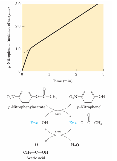 FIGURE 6–19 Pre–steady state kinetic evidence for an acyl-enzyme intermediate. The hydrolysis of p-nitro phenylacetate by chymotrypsin is measured by release of p-nitrophenol (a colored product). Initially, the reaction releases a rapid burst of p-nitrophenol nearly stoichio metric with the amount of enzyme present. This reflects the fast acylation phase of the reaction. The subsequent rate is slower, because enzyme turnover is limited by the rate of the slower deacylation phase.