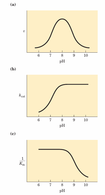 FIGURE 6–20 The pH dependence of chymotrypsin-catalyzed reactions. (a) The rates of chymotrypsin-mediated cleavage produce a bell-shaped pH-rate profile with an optimum at pH 8.0. The rate (v) being plotted is that at low substrate concentrations and thus reflects the term kcat/Km. The plot can be broken down to its components by using kinetic methods to determine the terms kcat and Km separately at each pH. When this is done (b and c), it becomes clear that the transition just above pH7 is due to changes in kcat, whereas the transition above pH 8.5 is due to changes in 1/Km. Kinetic and structural studies have shown that the transitions illustrated in (b) and (c) reflect the ionization states of the His57 side chain (when substrate is not bound) and the -amino group of Ile16 (at the amino terminus of the B chain), respectively. For optimal activity, His57 must be unprotonated and Ile16 must be protonated.