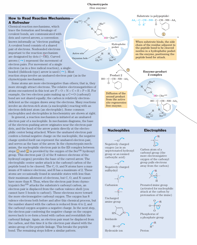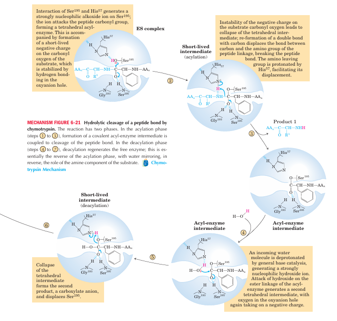 Bovine pancreatic chymotrypsin (Mr 25,191) is a pro tease, an enzyme that catalyzes the hydrolytic cleavage of peptide bonds. This protease is specific for peptide bonds adjacent to aromatic amino acid residues (Trp, Phe, Tyr). The three-dimensional structure of chymotrypsin is shown in Figure 6–18, with functional groups in the active site emphasized. The reaction catalyzed by this enzyme illustrates the principle of transition-state stabilization and also provides a classic example of general acid-base catalysis and covalent catalysis. Chymotrypsin enhances the rate of peptide bond hydrolysis by a factor of at least 109. It does not catalyze a direct attack of water on the peptide bond; instead, a transient covalent acyl-enzyme intermediate is formed. The reaction thus has two distinct phases. In the acylation phase, the peptide bond is cleaved and an ester linkage is formed between the peptide carbonyl carbon and the enzyme. In the deacylation phase, the ester linkage is hydrolyzed and the nonacylated enzyme regenerated.