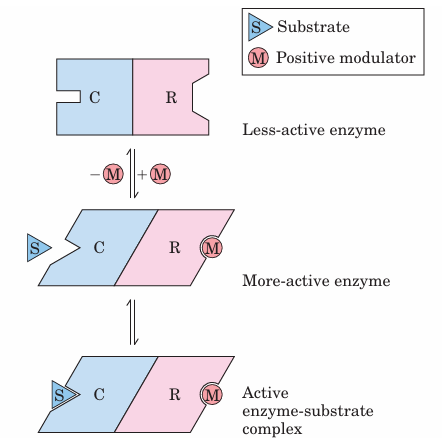 FIGURE 6–26 Subunit interactions in an allosteric enzyme, and in teractions with inhibitors and activators. In many allosteric enzymes the substrate binding site and the modulator binding site(s) are on different subunits, the catalytic (C) and regulatory (R) subunits, respectively. Binding of the positive (stimulatory) modulator (M) to its specific site on the regulatory subunit is communicated to the catalytic subunit through a conformational change. This change renders the catalytic subunit active and capable of binding the substrate (S) with higher affinity. On dissociation of the modulator from the regulatory subunit, the enzyme reverts to its inactive or less active form.