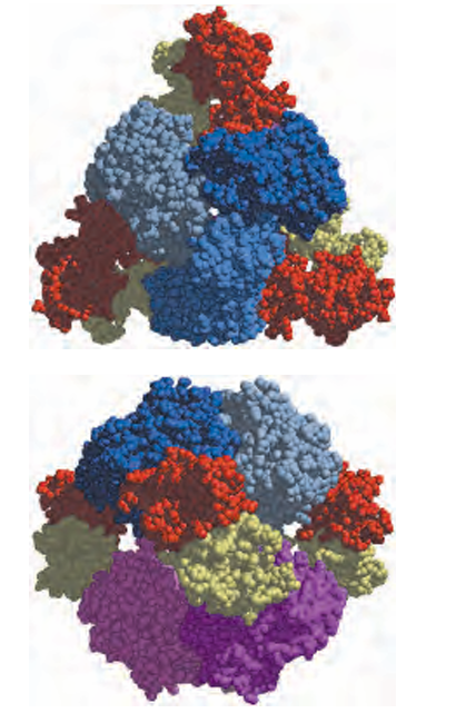 FIGURE 6–27 Two views of the regulatory enzyme aspartate transcarbamoylase. (Derived from PDB ID 2AT2.) This allosteric regulatory enzyme has two stacked catalytic clusters, each with three catalytic polypeptide chains (in shades of blue and purple), and three regula tory clusters, each with two regulatory polypeptide chains (in red and yellow). The regulatory clusters form the points of a triangle surround ing the catalytic subunits. Binding sites for allosteric modulators are on the regulatory subunits. Modulator binding produces large changes in enzyme conformation and activity. The role of this enzyme in nucleotide synthesis.