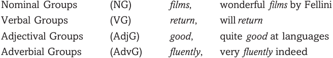 Groups are classified according to the class of the word operating as the main or ‘head’ element. Headed by a noun, an adjective, an adverb and a verb respectively, we can identify the following classes: