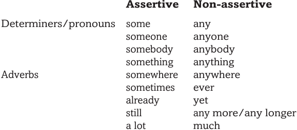 The any words (together with ever and yet, among others) are what we call ‘non- assertive’ items, as opposed to some and its compounds, which are ‘assertive’. Assertive forms have factual meanings and typically occur in positive declarative clauses. Non-assertive words such as any are associated with non-factual meanings in the sense of non-fulfilment or potentiality, which is a feature of negative, interrogative, conditional and comparative clauses, and semi-negative words such as without and hardly, among others. It is, in fact, the general non-factual meaning, rather than any particular structure which provides the context for non-assertive items to be used: