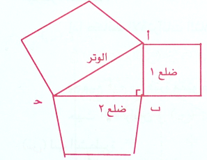 مساحة المربع المنشأ على وتر المثلث القائم الزاوية يكافئ مجموع مساحتي المربعين المنشأين على ضلعين الآخرين وبالرموز (أ جـ)2 = (أ ب)2 + (ب جـ)2