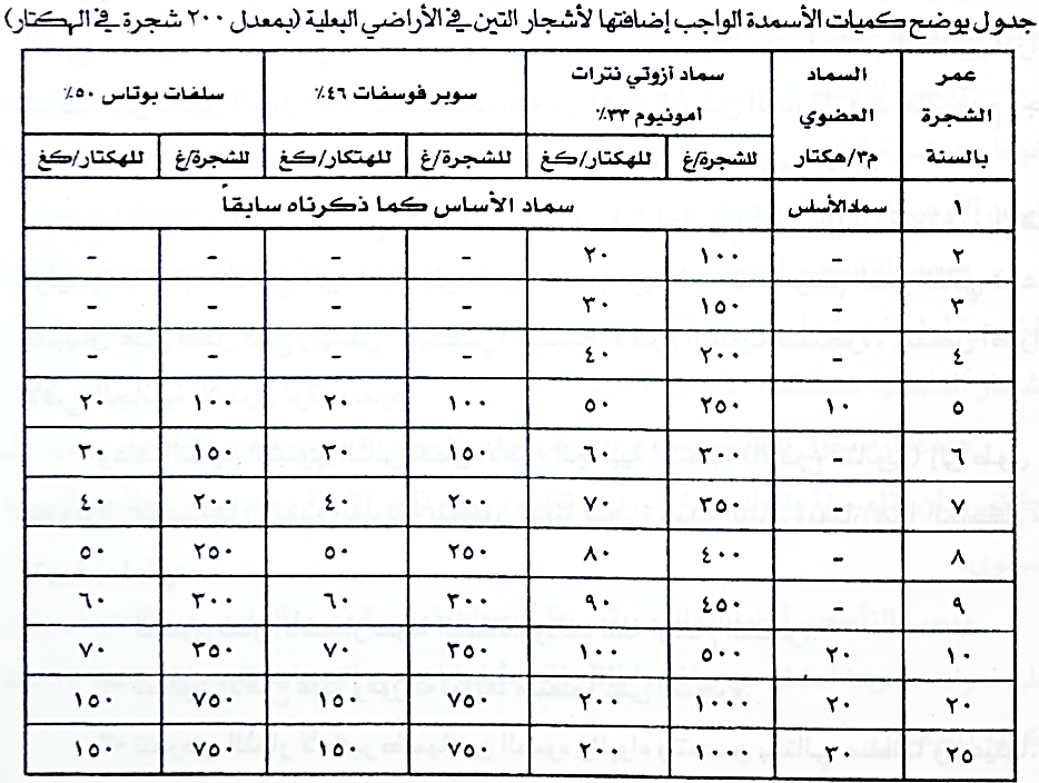 فيما يلي جداول عن كميات الاسمدة المطلوب اضافتها لأشجار التين في الزراعة المروية وفي الزراعة البعلية وذلك بالتلازم مع عمر الاشجار.