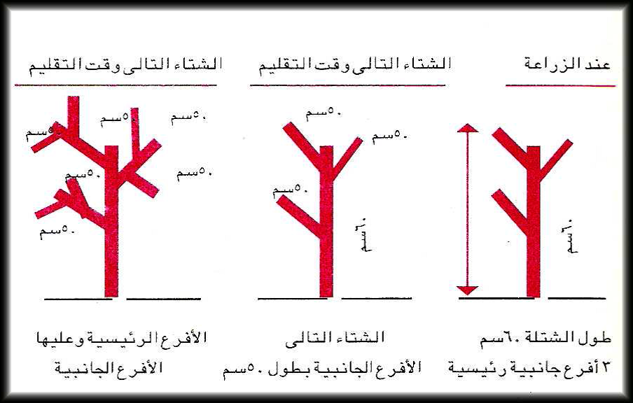 - بعد زراعة الشتلة تقصر الى ارتفاع ٥٠-٧٠ سم من سطح الأرض.