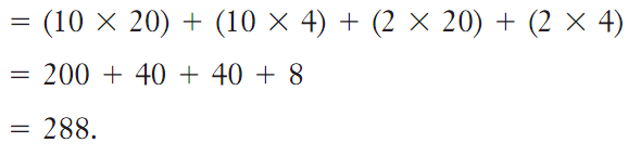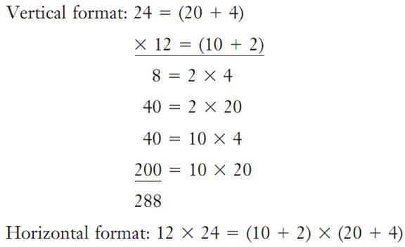 The following presents a multiplication algorithm in a vertical and horizontal format. Consider 24 x 12. To understand this, write 24 as 20 + 4, and 12 as 10 + 2.