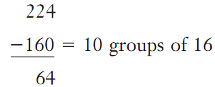 Consider the following problem. There are 224 bananas. Each crate is packed with 16 bananas. How many crates are needed to pack all the bananas? Find the number that results from dividing 224 by 16. In other words, how many groups of 16 bananas are there in 224 total bananas?