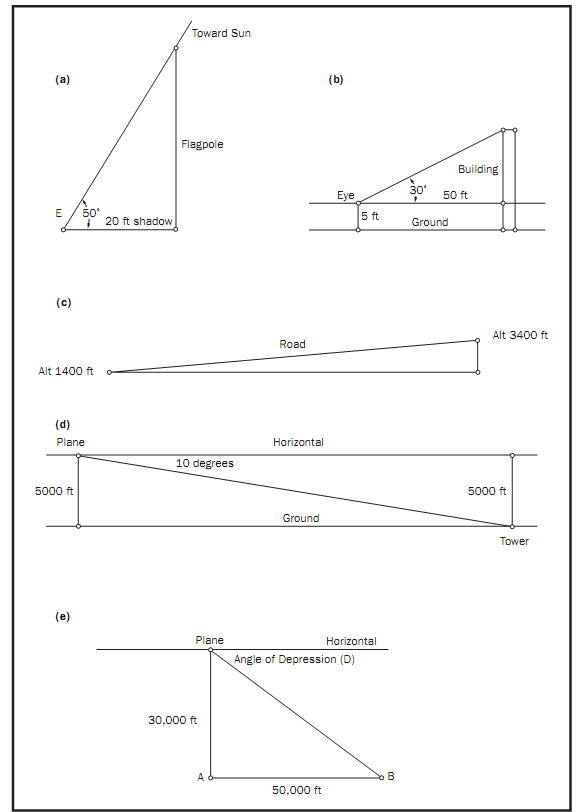 See part (d) of the figure. If d represents the direct distance to the tower (measured along the hypotenuse), the pilot can find the distance by solving the equation sin 10° = 5,000/d, which yields a solution of approximately28,800 feet, or close to 5 1/2 miles.