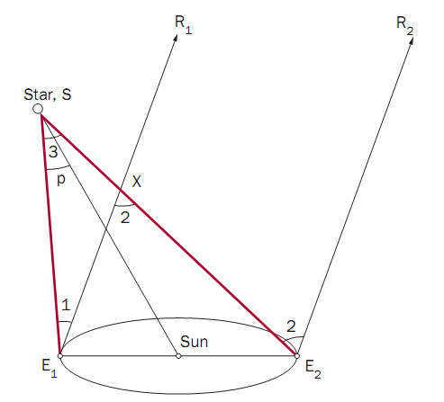 Using the figure below, the angle between the star of interest and a reference star may be observed. This is the angle SE1R1. Exactly six months later, the angle between the reference star and the star of interest forms the angle SE2R2. Because the reference star is so distant, the lines E1R1 and E2R2 can be considered to be parallel. Therefore angle E1XE2 = angle SE2R2, and the angle E1SE2 (∠3 +∠1 = ∠2) may be calculated. This angle is known as the parallax of a star. The measurement that astronomers use is called the “stellar parallax” and is half the angle E1SE2.