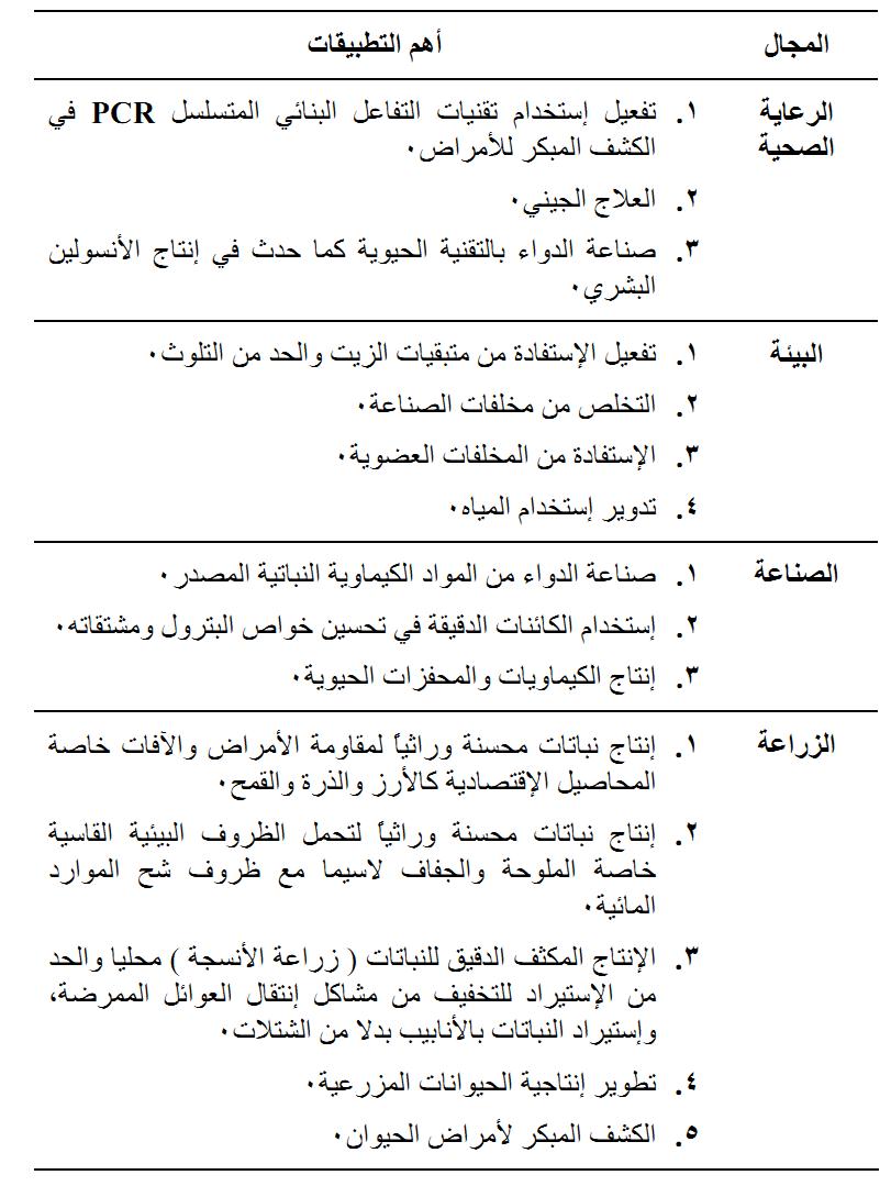 بنظرة سريعة الى مجالات تطبيق التقانات الحيوية وتفعيل الاستفادة منها نجد ان هناك حاجة ملحة الى تبني برنامج واضح وواعد لاستخدام تقانة المستقبل، ولإجراء ذلك يجب علينا في الدول العربية معرفة وضعنا من تلك التقنيات وتحديد امكاناتنا المادية والبشرية والتنسيق في ما بيننا للتعاون في التغلب على الصعوبات التي تقف حجر عثرة دون استفادتنا من تلك التقنيات. ويوضح الجدول التالي ملخص وافيا لبعض الجوانب التطبيقية لهذه التقنية.