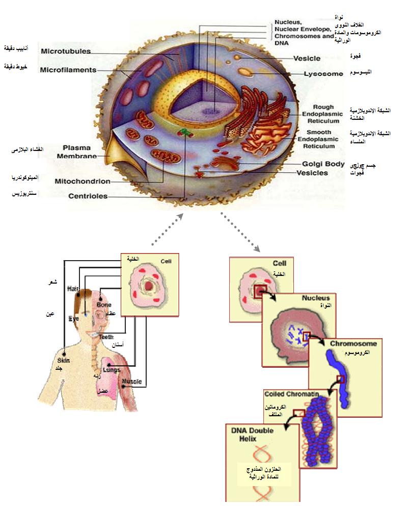 تتكون الكائنات الحياة من اجزاء رئيسية كالأعضاء والتي تتكون من انسجة، والانسجة بدورها تتكون من ملايين من الخلايا؛ وذلك في الكائنات معقدة من حيث التركيب كما في الانسان والحيوان والنبات وقد يتكون الكائن الحي من خلية واحدة فقط او من عدد محدود من الخلايا كما في البكتيريا والفطريات. وتقوم كل خلية بوظيفية محددة بحسب نوعها والنسيج الذي تنتمي الية (شكل 1 )