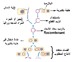 وهذه البلازميدات الحاملة للجينات يمكن إعادة إدخالها فى خلايا بكتريا Bacteria أو خلايا الخميرة Yeast cells وذلك بإضافة هذه البلازميدات الحاملة للجينات Vectors إلى أطباق بترى المحتوية على خلايا البكتريا أو خلايا خميرة . وفى هذه المزرعة الموجودة بطبق بترى تقوم كل خلايا البكتريا أو الخميرة بإلتهام ( إدخال) البلازميدات Plasmids بداخلها . وبالتالى فكلما تنقسم تلك الخلايا كلما يتكرر Replicate البلازميد . وهذه الطريقة تسبب تضاعف الجين الموجود على البلازميد والذى يقال عليه فى هذه الحالة أنه يتم نسخه خضريا Cloned . وبالتالى فعملية النسخ الخضرى Cloning تسبب إنتاج عدد كبير جدا من النسخ المطابقة للجين الغريب الموجود على البلازميد والذى يمكن استخدامه فى هذه الحالة فى إنتاج مواد كيميائية حيوية نافعة مثل الهرمونات Hormones . |