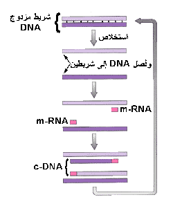 الشكل يوضح طريقة عمل الجينات من m-RNA ، وفى هذه الطريقة يستخلص m-RNA ويستخدم كقالب لإنتاج مكمل من DNA يصطلح على تسميته فى هذه الحالة c-DNA حيث هو ناتج من عملية النسخ العكسى Reverse transcription ثم يوضع الخيط فى محلول قلوى لإذابة m-RNA ويتبقى خيط c DNA الذى يستخدم كقالب لإنتاج خيط مزدوج من c DNA .