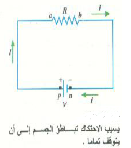 وحيث أن الطرف a للمقاوم متصل بالطرف الموجب للبطارية ، فإن النقطة a عند جهد أعلى من النقطة b. وأية شحنة موجبة حرة الحركة خلال المقاومة سوف تتحرك من a إلى b. وبعبارة أخرى من الجهد المرتفع إلى الجهد المنخفض. ومن ثم يكون اتجاه التيار خلال المقاوم من a إلى b. وفي الحقيقة فإن: