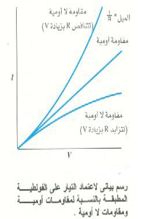 وبناء على هذا فإن المعادلة 1)) كثيراً ما تسمى قانون اوم. على ان الدقة تستدعي أن ينطبق قانون أوم فقط على المقامات التي يكون فيها I متناسباً مع V على مدى معين من قيم V ، I ومثل هذه المقامات تسمى مقامات أومية، وتتميز بأن الرسم البياني بين I و V يكون خطأ مستقيماً كالمبين في الشكل (2) ، ليست ثابتة ، وإنما تعتمد على قيم V و I و تسمى المقاومات في هذه الحالة لا أومية. وتكون الخطوط البيانية للعلاقة بين I و v بالنسبة لهذه المواد الخطية ، كما هو مبين في الشكل ((2نسبة لهذه المواد الخطية ، كما هو مبين في الشكل امات التي يكون فيها مرتفع إلى الطرف ذي الجهد المنخفض للمقاوم . طدام مع ذرات ا