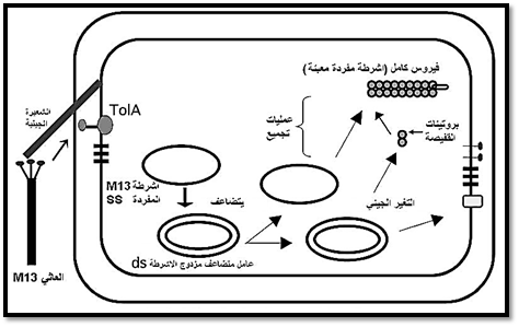 شكل 2 : تركيب ودورة تضاعف العاثي الخيطي M13