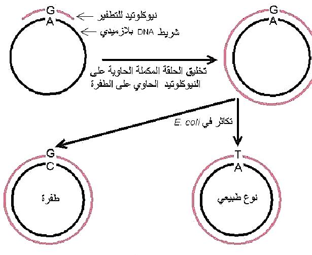 ويتم تحضير النيوكلوتيدات بالتوالي المطلوب الذي يحوي على الطفرة وتهجينها مع عاثيات مفردة الاشرطة من DNA ذات تواليات طبيعية، كما موضح في الشكل (1).