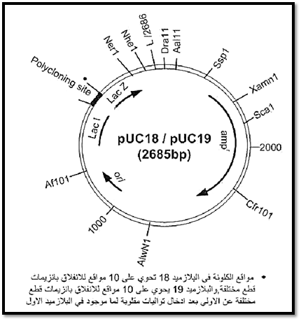 • البلازميد pUC18 ، pUC19 من البلازميدات المهمة المستعملة في كلونة الجينات وخارطتها العامة موضحة في الشكل (3).
