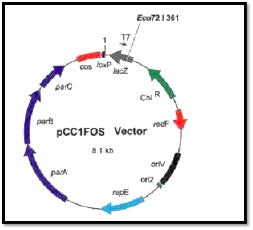 4- الفوزميدات Fosmids : نواقل وراثية تشابه الكوزميدات ولكن البلازميد المستعمل هو بلازميد الخصوبة F – plasmid. ويكون استعماله في الكلونة محددا نظراً لآنه يستعمل في E. coli كمضيف له، والخلايا يمكن ان تحوي فوزميد واحد فقط. والفوزميدات تكون أعداد نسخ واطئة مما يضفي عليها الثباتية مقارنة بالكوزميدات التي تكون عدد كبير من النسخ، استخدمت هذه النواقل وساعدت في برامج تحديد توالي الجينوم البشري. والشكل (10) يوضح تركيب احد هذه النواقل.