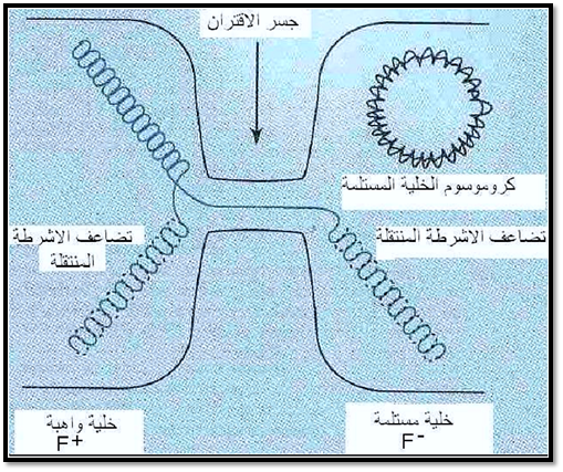 طريقة من طرق نقل المعلومات الوراثية داخل الانظمة الحية وتحصل عند تلامس الخلايا الواهبة والخلايا المستلمة وتكوين جسور سايتوبلازمية بينهم ويتم نقل جزء من جينوم الخلايا الواهبة او كله وتتميز الخلايا الواهبة باحتوائها على البلازميدات الاقترانية وتسمى البلازميدات الجنسية ومنها بلازميد الخصوبة F factor او يسمى F plasmid الذي يوجد بكثرة في الخلايا السالبة لصبغة كرام مثل E. coli وتكون الخلايا الواهبة +F اما الخلايا المستلمة -F. وتحوي البلازميدات الاقترانية اضافة الى نقطة تضاعف على عدد من الجينات الاخرى مثل tra وغيرها مثل