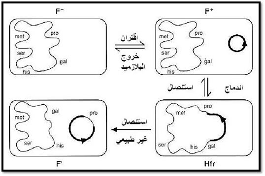 وعند حصول استئصال غير طبيعي للبلازميد F فانه يكون F' Plasmid الذي يحوي جزءا من كروموسوم الخلية كما موضح في الشكل ويمكن ان تحدث الحالة العكس اذ يمكن ان تبقى بعض الجينات البلازميدية في كروموسوم الخلية كما يحصل مع بلازميد المقاومة R plasmid وينتج R' .