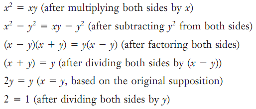 If division by 0 were allowed, it could be proved—falsely—that 1= 2. Suppose x =y. Using valid properties of equations, the above equation is rewritTen
