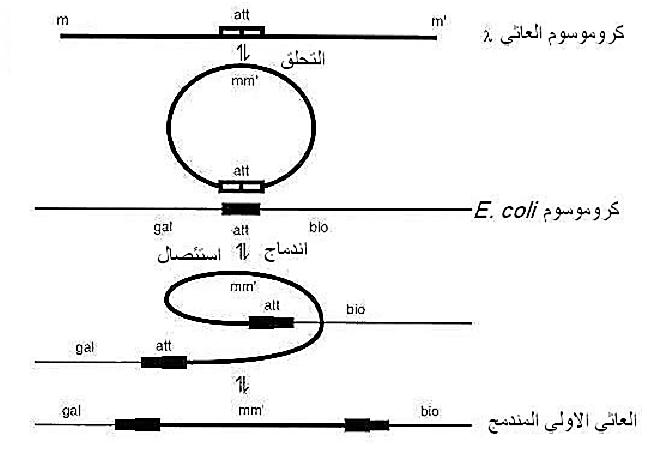 ويوضح الشكل احتواء جينوم العاثي على موقع الارتباط att على كروموسوم العاثي وجينوم E.coli التي تحوي على توالي متشابه يصل الى 15 نيوكلوتيد وهي التي يحدث فيها التأشب المعكوس. وتحاط منطقة التأشب بتواليات غير متشابهة. في العاثي يكون ناتج الجين int هو انزيم الاندماج Integrase الذي يكون لازما لعملية الدمج وادخال قطع من DNA الجديدة في الجينوم المستلم اثناء احداث الاستذابة، وناتج الجين ixs الذي يشفر لأنزيم الاستئصال Exocisionase الذي يكون ضروريا لاستئصال القطعة من الجينوم البكتيري التي ستزال لتوضع مكانها القطعة الجديدة. ويدخل العاثي λ في المنطقة الواقعة بين bio المسئول عن تخليق البايوتين و gal المسئول عن استهلاك الكلاكتوز.
