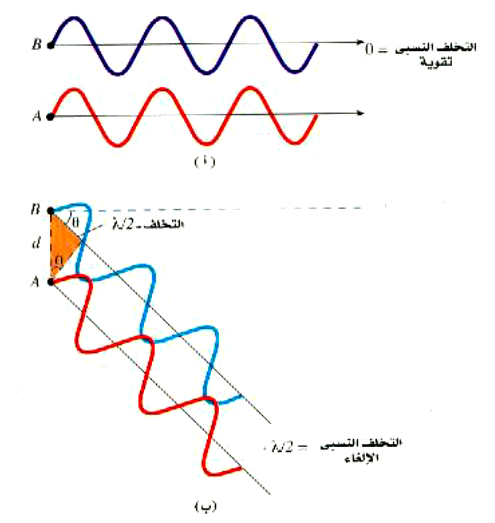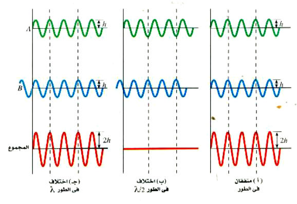 ان الموجات المتشابهة إما أن يقوى بعضها بعضاً. وإما يلغى بعضها بعضاً. ولكي نسترجع هذه الحقيقة سنعتبر أن لدينا موجتين A و B كما في الشكل 2)). والموجتان المرسومتان في الجزء (أ) متفقتان في الطور أي أن قمة تقع فوق قمة وقاع يقع فوق قاع. وعندما تجمع الموجتان فإن الموجة المحصلة ستكون ضعف أي من الموجتين الأصليتين. إن الموجتين المبينتين في (أ) تمران بتداخل بناء.