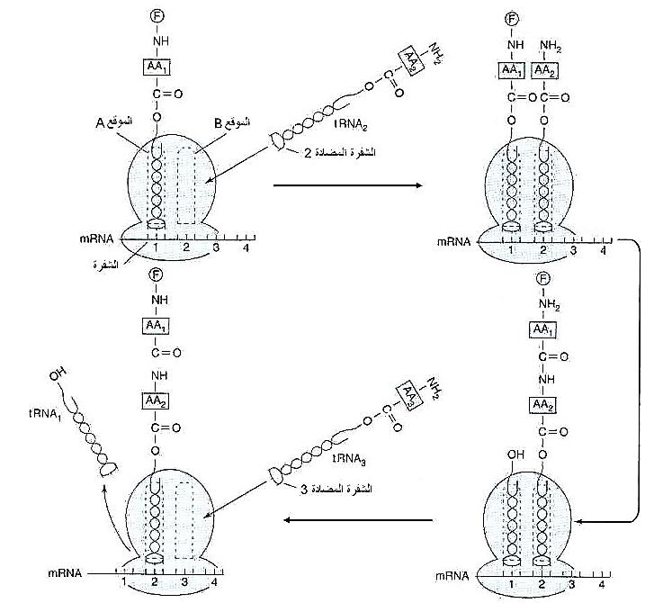 الجزيئات الناتجة من الانتساخ والمعدة للترجمة تكون مكونة من شفرات فعالة في mRNA الذي يحوي على موقع الارتباط بالرايبوزوم (rbs) Ribosome binding site ومن جهة ثانية يتم تنشيط الحوامض الأمينية انزيما وتنقل بواسطة tRNA وفق الشفرة المطلوبة بمساعدة الانزيم Amino acyl tRNA synthetase. وجزيئات tRNA تحوي على شفرات مكملة Anticodon للشفرات الموجودة على mRNA، ويجلب الحامض الأميني بعد تكوين معقد البدء والتي تشمل عددا من العوامل البروتينية، مجموعة للبدء واخرى للاستطالة او غيرها من الاغراض اضافة الى اشتراك العديد من الانزيمات. وتبدأ قراءة الرايبوزومات للشفرات على mRNA بالاتجاه من 5' الى 3'. ويجلب اول حامض اميني الى الموقع (Accepting site) A على الرايبوزوم، ويكون الحامض الأميني الأول الذي يترجم هو الميثايونين (formyl- methionine) AUG في بداية النواة، ثم يأتي الحامض الثاني الى الموقع (Peptidyl site) P على الرايبوزوم. ويتم ربط الحامضين الأمينية بآصرة ببتيدية بتأثير الانزيم Peptidyl transferase والذي هو rRNA 23S ويسمى أيضاً Ribozyme، ويتحرك الرايبوزوم بعد ذلك مسافة شفرة واحدة لينقل الحامض الاميني الثاني الى الموقع A ويبقى الموقع P شاغرا مستعدا لاستقبال حامض أميني ثالث الى ان تترجم كل الشفرات الى ما يقابلها من الحوامض الامينية. ويكون تجمع السلسلة البيتيدية من النهاية الأمينية للحامض الى النهاية الكاربوكسيلية وبذا يكون تسلسل الحوامض الامينية في البروتين مكمل لتوالي القواعد النتروجينية في mRNA وبالتالي مع تواليها في DNA وعملية الترجمة موضحا في الشكل (1). ويلاحظ في الخلايا بدائية النواة ان الجينات ذات العلاقة الوظائفية تتجمع مع بعضها مكونة الاوبرون (Operon) والحالة تكون نادرة في الخلايا حقيقية النواة.