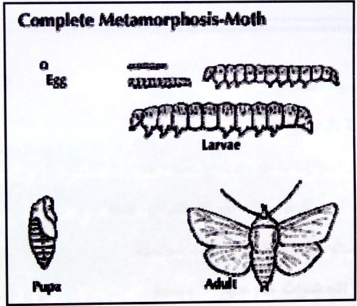 في هذا النوع من الحشرة تفقص البيضة ويخرج منها يرقة Larva ثم عذراء Pupa ثم حشرة كاملة حيث ان: