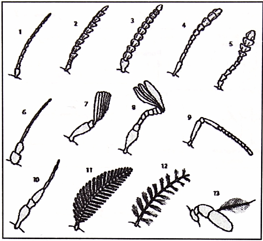 12- الريشي Plumose: شبيه بالريش وتحمل شعرات طويلة تخرج من مواضع اتصال العقل, مثل ذكر البعوض. واذا كان الشعر قصير يطلق عليه ريشي بسيط Pilose كما في اناث البعوض.