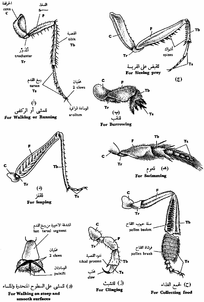 رسم تخطيطي يوضح التحورات التكيفية لأرجل الحشرات