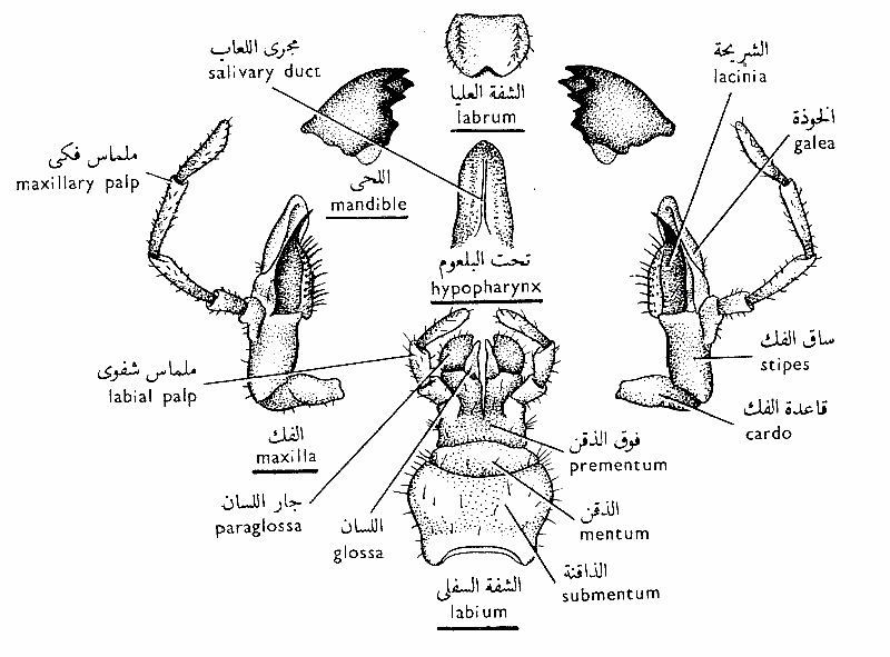 واللحيان والفكان هم المسؤولان عن عملية مضغ الطعام، بينما تعمل الشفة السفلى كما لو كانت غطاءً خلفيًا لبقية الأجزاء بالإضافة إلى حملها ملامس “Palpi” تساعد في عملية تحسس الطعام. وما بين كل هذه الأجزاء يوجد بنيان لحمى قصير كاللسان يسمى تحت البلعوم “Hypopharynx” وكثيرًا ما يفتح مجرى اللعاب، “ Salivary duct” على سطحه البطني.