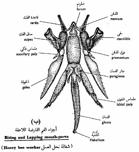 رسم تخطيطي يوضح اجزاء الفم القارضة اللاعقة (شغالة نحل العسل)