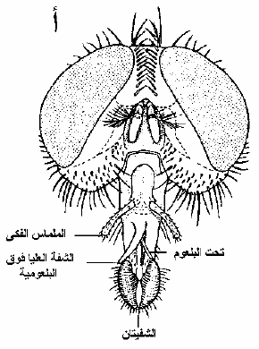 رسم تخطيطي يوضح اجزاء فم اسفنجية (الذبابة المنزلية)