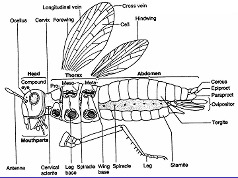 1- جسمها مقسم الى ثلاث مناطق واضحة : الراس والصدر والبطن وكل منها يتكون من حلقات عدة اندمج بعضها أثناء النمو الجنيني كما في الراس (5 حلقات) او بقيت واضحة كما في الصدر (3 حلقات) والبطن (11حلقة).