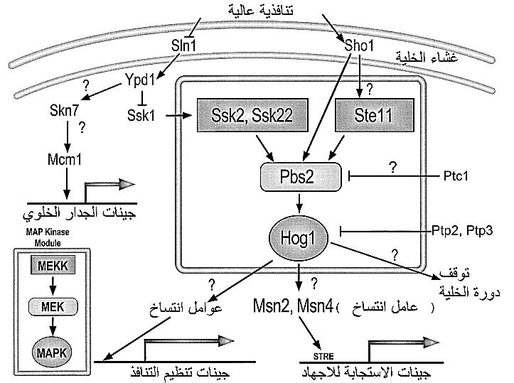 بعد ان تتم عملية التحسس بالضغط التنافذي تحصل عمليات تنشيط للمسار المعني بمعالجة الاجهاد وهو مسار (HOG pathway (High osmolarity glycerol وهو احد مسارات MAPK ويشبه نظام المكونين الموجود في البكتريا والموضح في الشكل (1).